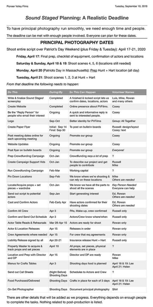 We are set to shoot Sound Staged over Patriot’s Day weekend: April 17-21, 2020. As described in the Meeting #9 and 10 (Really Big) Updates post, a lot needs to happen to meet that deadline successfully. This is exciting. A movie is being made. This is why Pioneer Valley Films exists! Join in, be a part of this, learn how to make a film. This is an incredible opportunity.